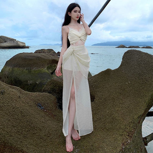Spaghetti Strap Knot Lace Panel Slit Maxi Sheath Dress