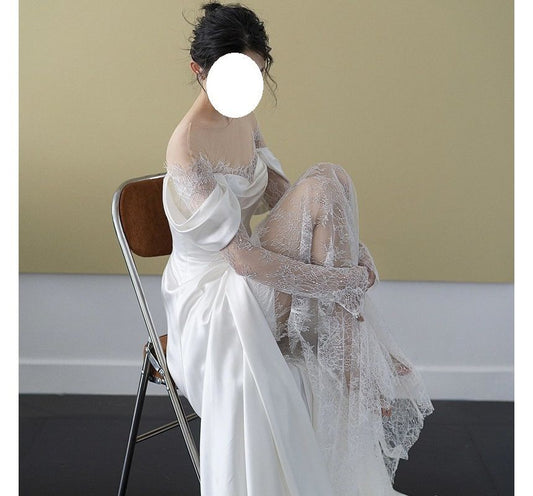 Long-Sleeve Off-Shoulder Plain Lace Panel A-Line Wedding Gown