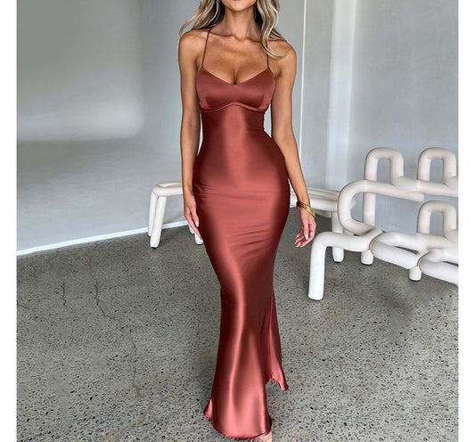 Spaghetti Strap V-Neck Plain Tie Back Satin Maxi Mermaid Evening Gown