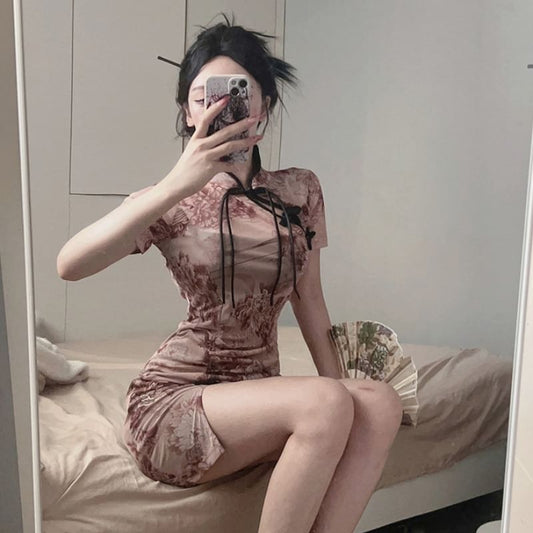 Short-Sleeve Floral Print Ruched Slit Mini Qipao