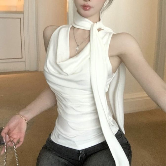 Set: Cowl Neck Plain Slim Fit Tank Top + Scarf