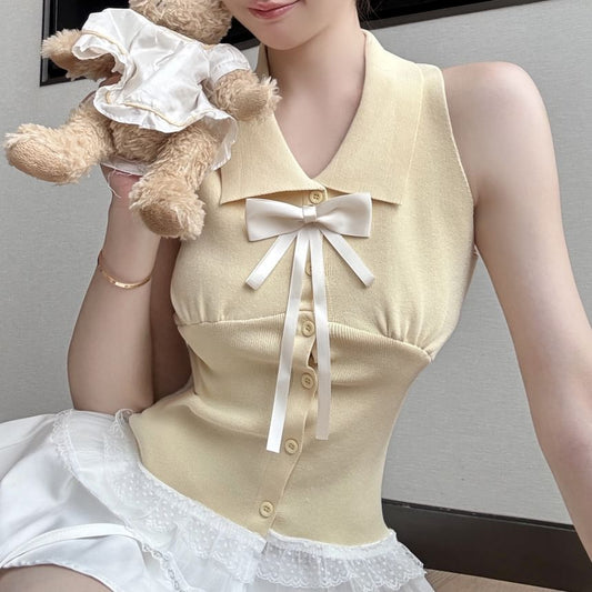 Collared Lace Panel Bow Accent Button-Up Tank Top