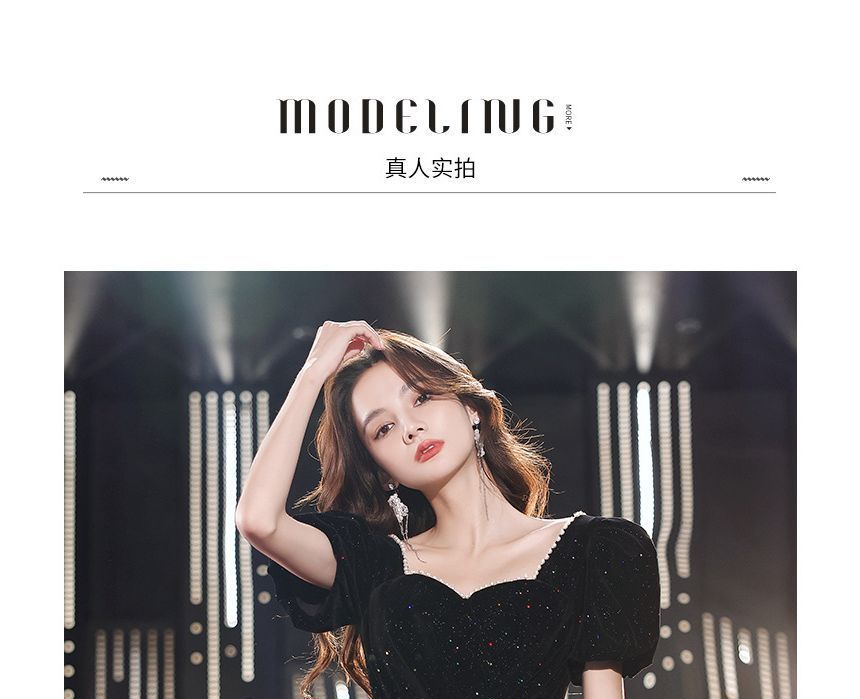 Puff-Sleeve Sweetheart-Neckline Faux Pear Trim Glitter A-Line Evening Gown