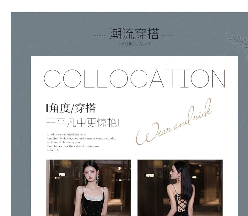 Spaghetti Strap Sweetheart Neckline Two Tone Rhinestone Accent Sequin Trained Open Back Mermaid Evening Gown