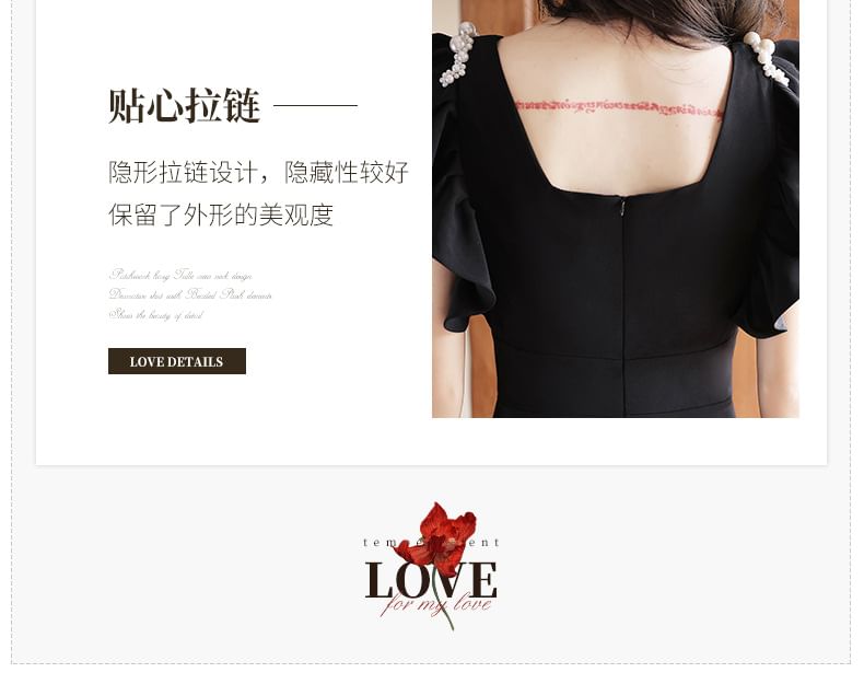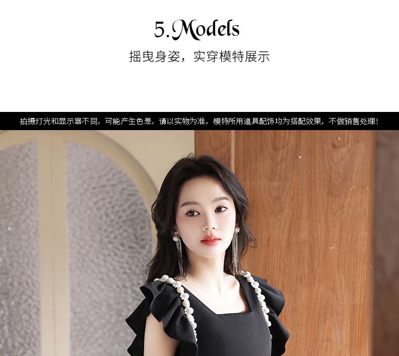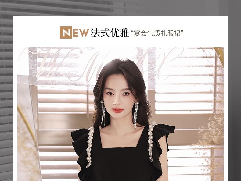 Cap-Sleeve Square Neck Plain Faux Pearl Maxi A-Line Evening Dress