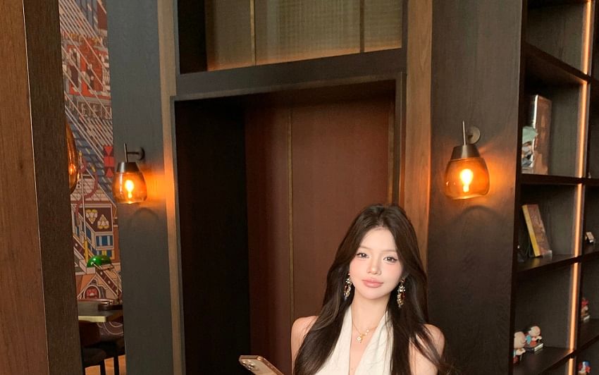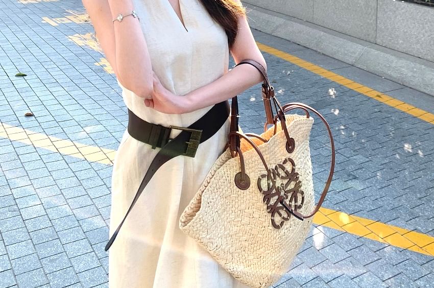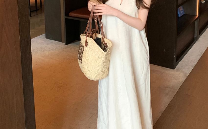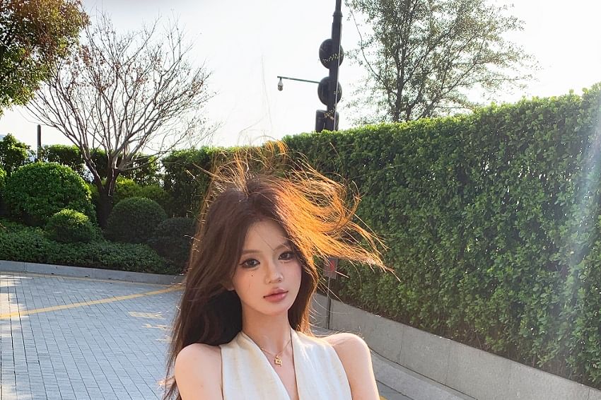 Halter-Neck Plain Midi A-Line Dress / Faux Leather Belt
