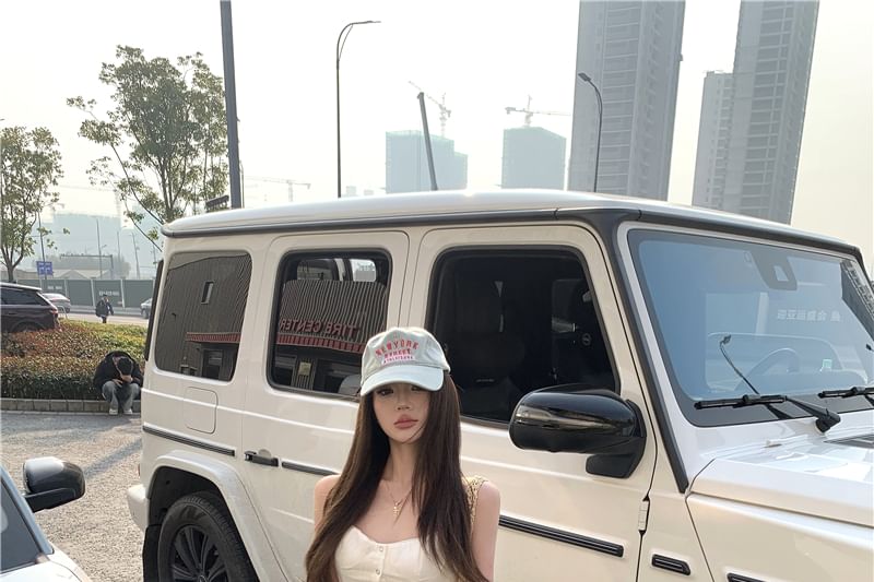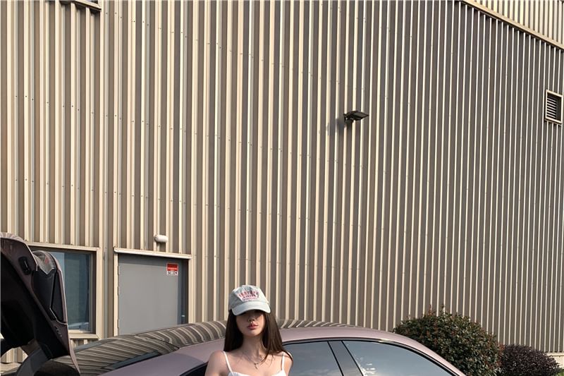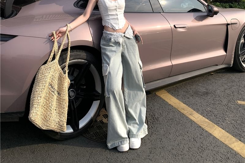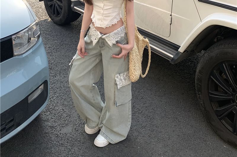 Lace Trim Button-Up Crop Camisole Top / Low Rise Washed Lace Panel Wide Leg Cargo Jeans