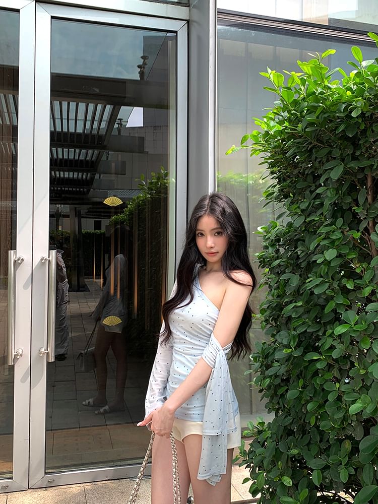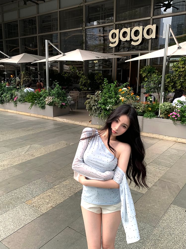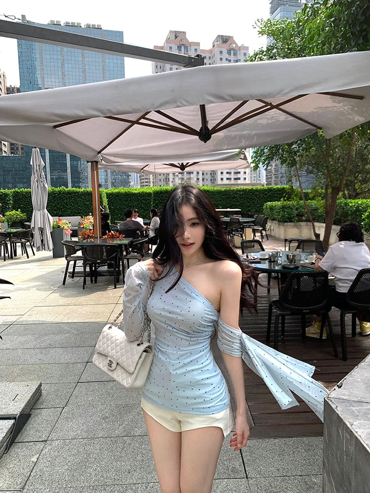 Long-Sleeve One-Shoulder Dotted T-Shirt