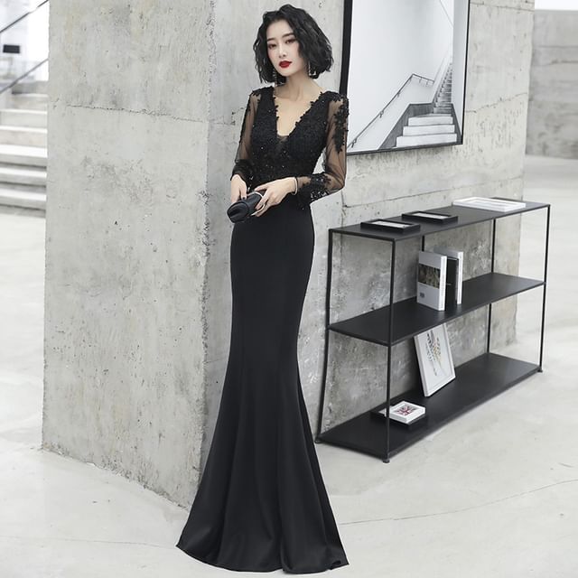 Long-Sleeve V-Neck Lace Panel Mermaid Evening Gown / Sleeveless Evening Gown