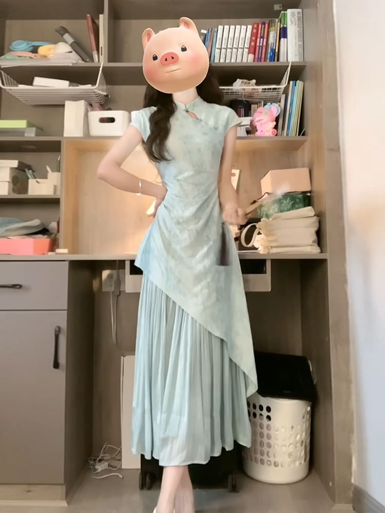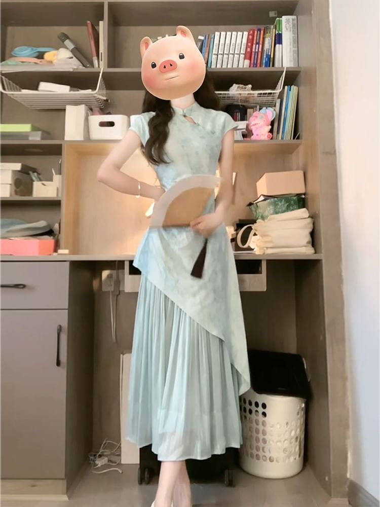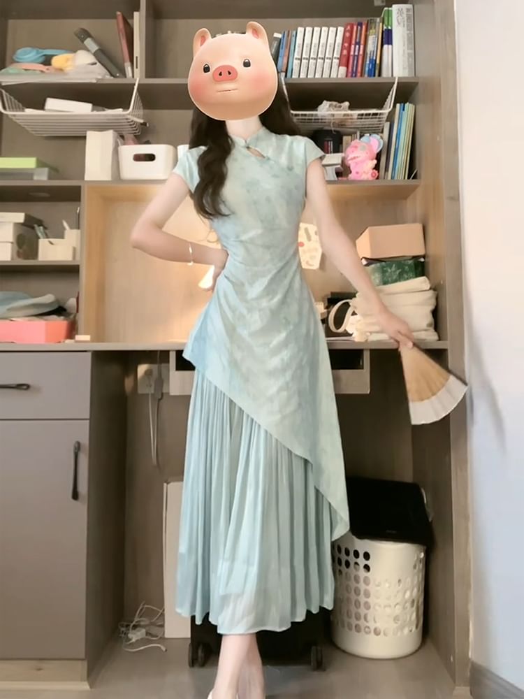 Short-Sleeve Floral Panel Midi A-Line Qipao