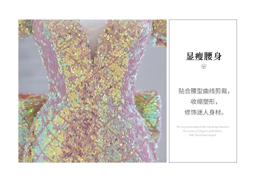 Short-Sleeve Plunged Sequined Mermaid Evening Gown