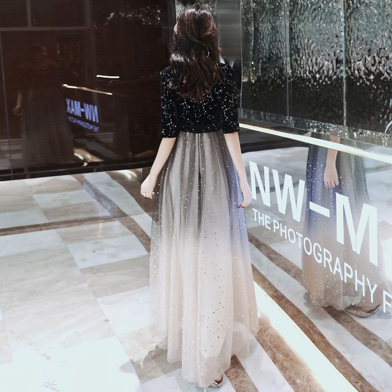 Short-Sleeve Square Neck Glitter Gradient Evening Gown / Cocktail Dress