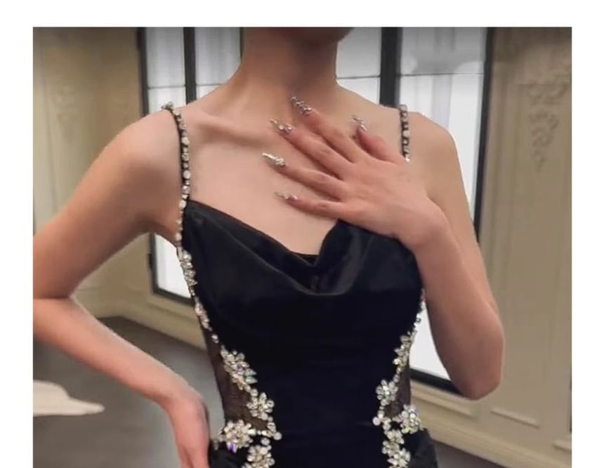 Spaghetti Strap Cowl Neck Lace Panel Rhinestone Accent A-Line Evening Gown
