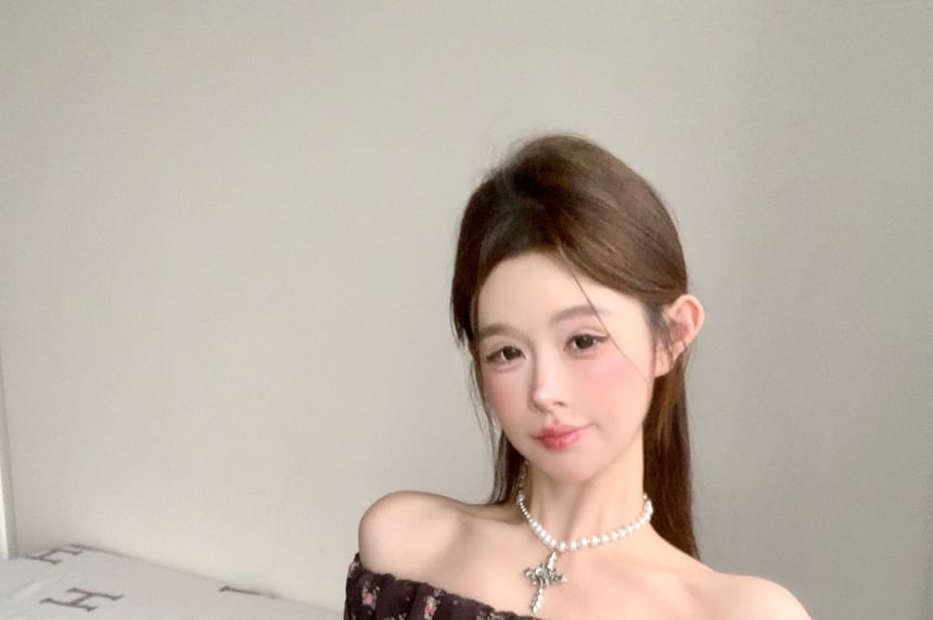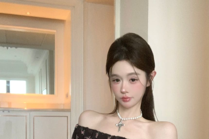 Ruffle Slim Cap-Sleeve Fit Trim Off-Shoulder Tee Panel Floral