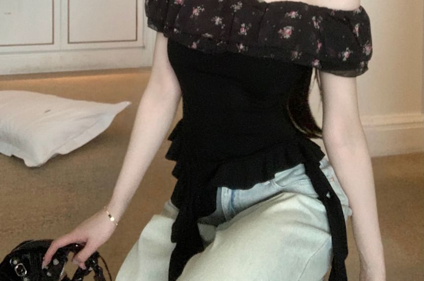 Cap-Sleeve Off-Shoulder Floral Panel Ruffle Trim Slim Fit Tee