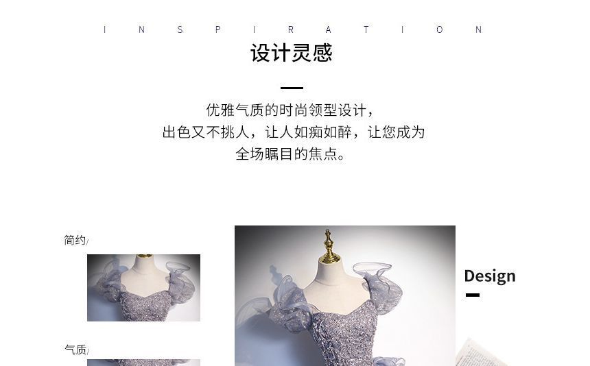 Sequin Neck Square Panel Evening Gown A-Line Ruffle Puff Sleeve Mesh