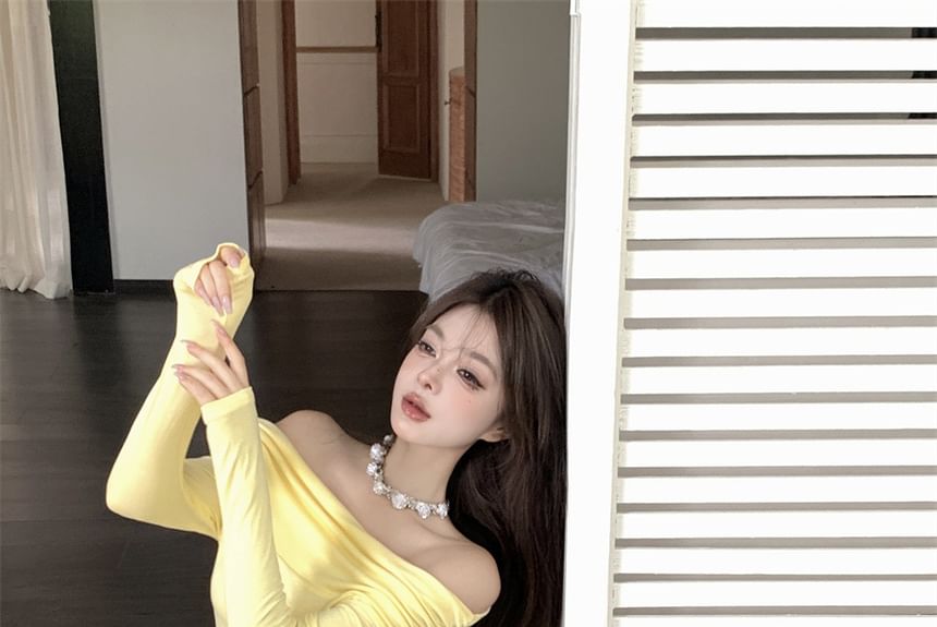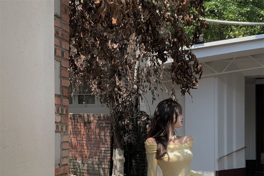 Set: Long-Sleeve Off-Shoulder Plain Crop Slim Fit Tee + High Waist Maxi A-Line Skirt