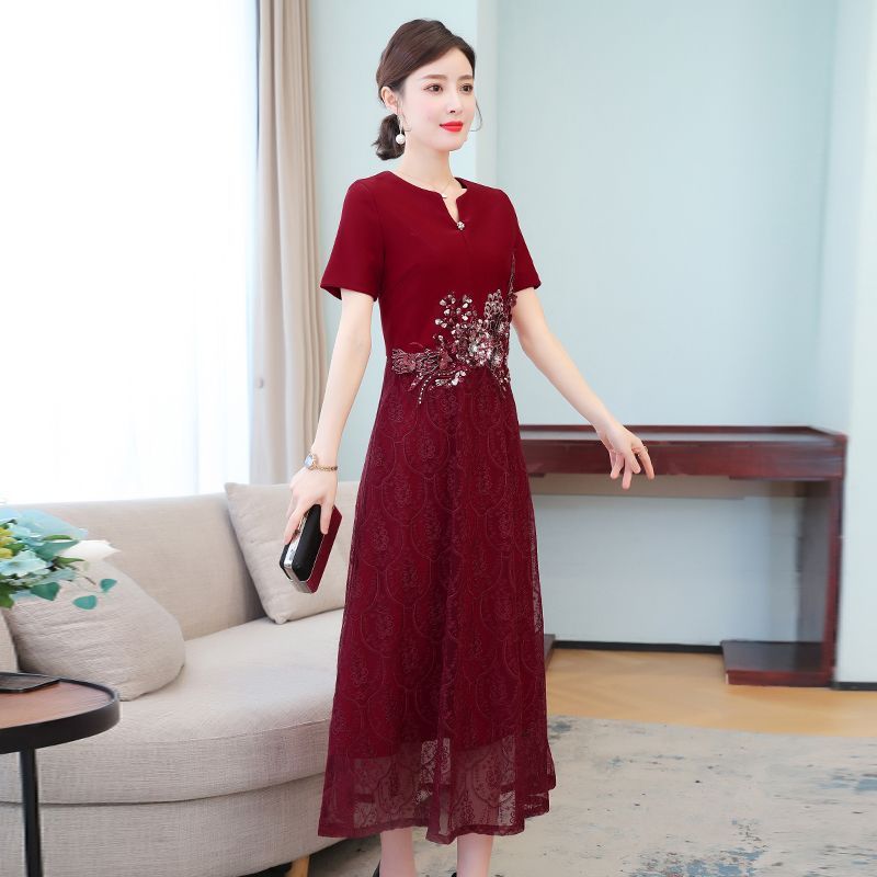 Short-Sleeve Floral Embroidered Midi A-Line Lace Qipao Dress