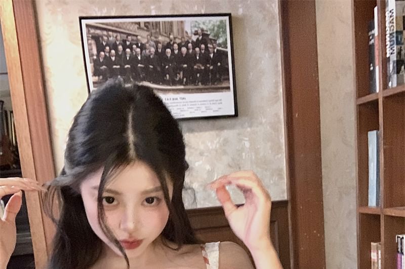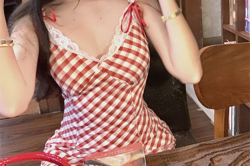 Spaghetti Strap Plaid Lace Trim Bow Mini Bodycon Dress