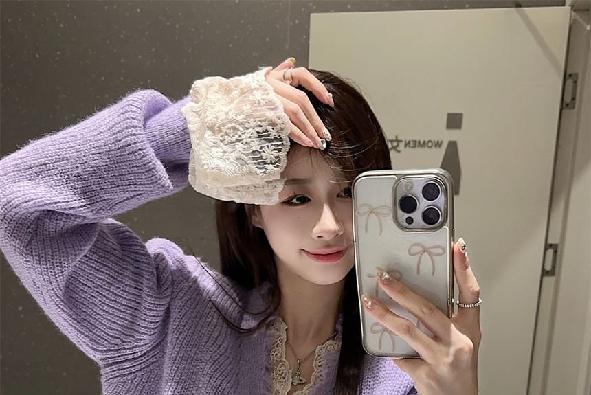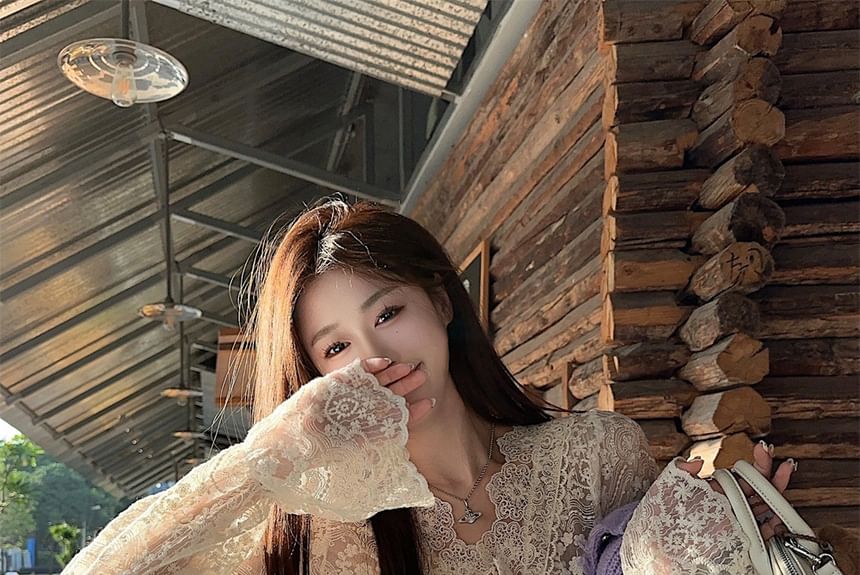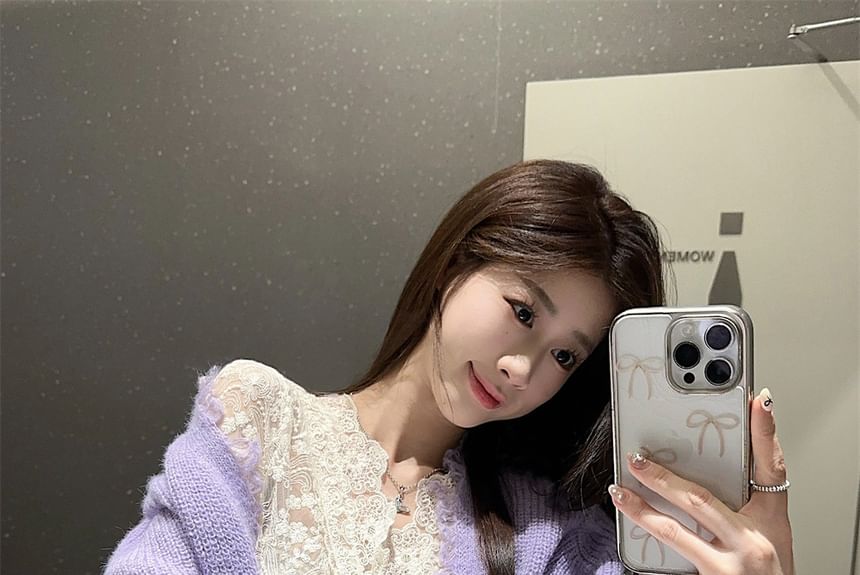 V-Neck Plain Fringed Button-Up Crop Cardigan / Long-Sleeve Lace Blouse