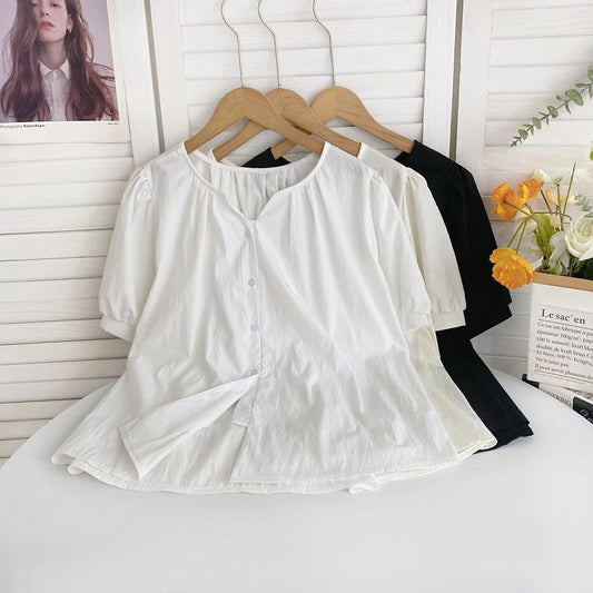 Puff Sleeve V-Neck Plain Ruffle Blouse