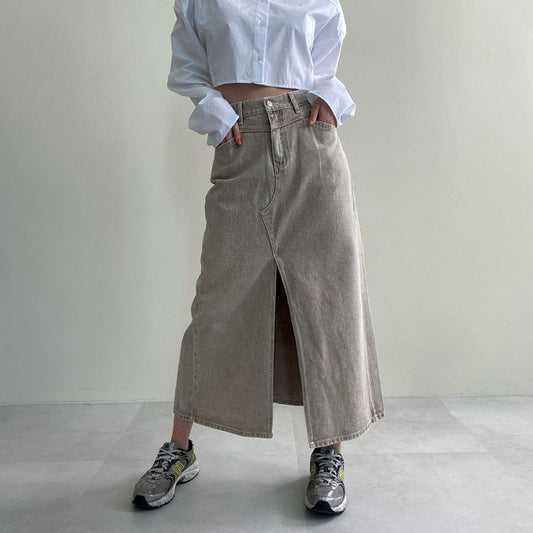 High Waist Front-Slit Denim Maxi A-Line Skirt