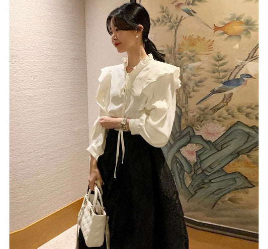 Puff-Sleeve Plain Ruffled Blouse / High Waist Midi A-Line Skirt