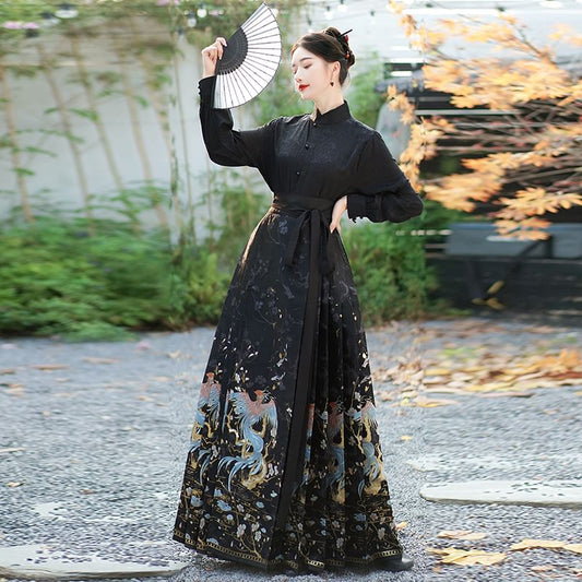Band Collar Plain Blouse / Mid Rise Hanfu Patterned Maxi A-Line Skirt