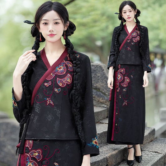 Traditional Chinese 3/4-Sleeve Crew Neck Floral Embroidered Jacquard Frog Buttoned Blouse / High Rise Contrast Trim Maxi A-Line Skirt / Set