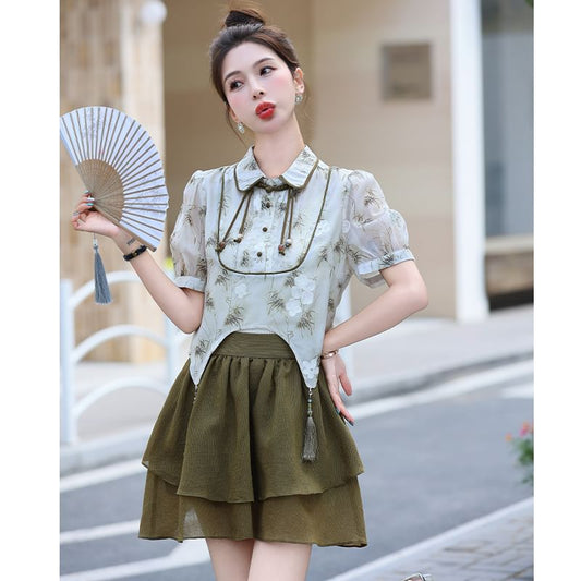 Set: Short-Sleeve Floral Asymmetrical Cropped Frog Button Blouse + Elastic Waist Mini A-Line Skirt