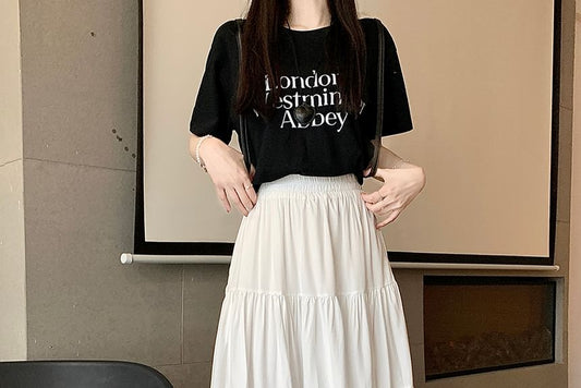High Rise Plain Frill Trim Midi A-Line Skirt