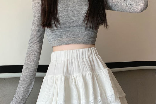 Set: Long-Sleeve Collared Plain Crop Top + High Rise A-Line Skirt