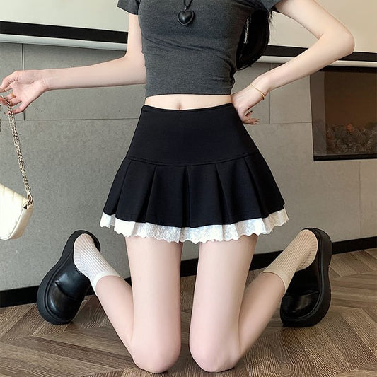 Trim Plain Waist Tiered Mini A-Line Elastic Balletcore Lace Skirt
