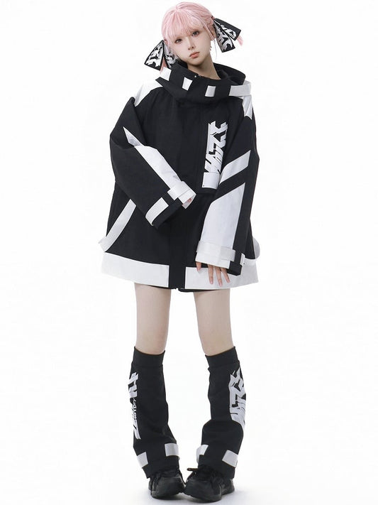 Black and White Jirai Kei Techwear Straps Hooded Windbreaker Jacket