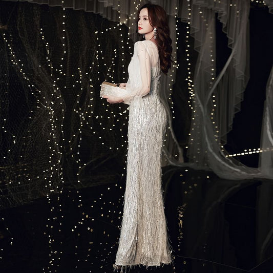 Puff-Sleeve V-Neck Sequined Fringed Mermaid Evening Gown