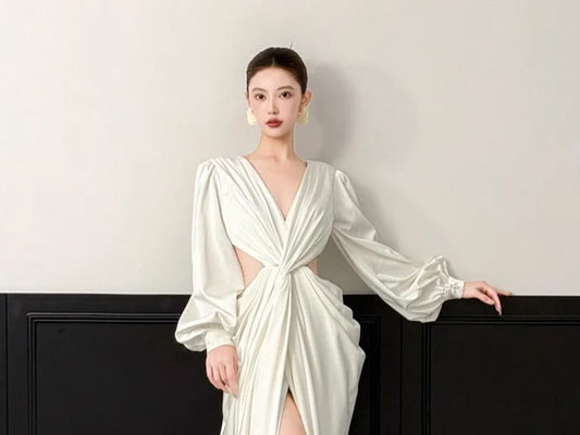 Puff-Sleeve V-Neck Plain Knotted Slit A-Line Evening Gown