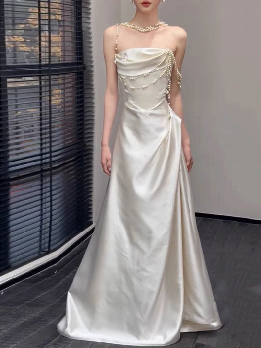 Strapless Faux Pearl Strap A-Line Evening Gown