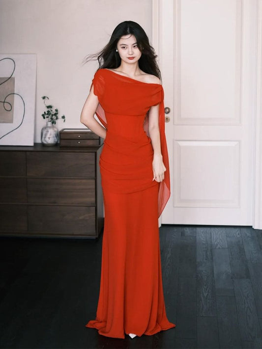 Off-Shoulder Open Back Shirred Mermaid Evening Gown