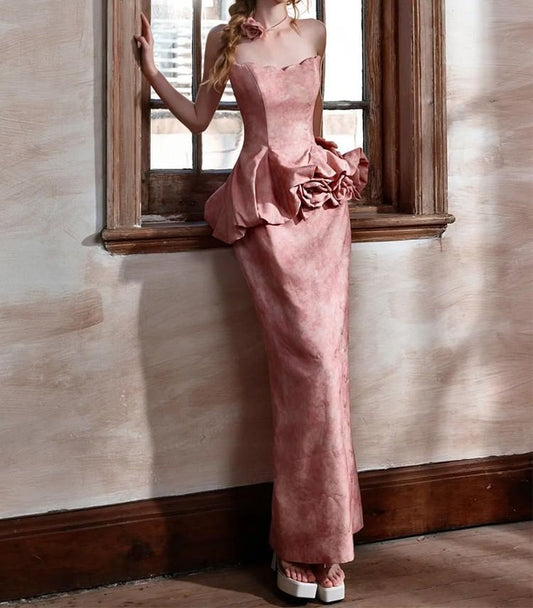 Strapless Floral Peplum Mermaid Evening Gown