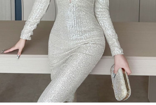 Long-Sleeve Deep Plunge Sequin Mermaid Evening Dress