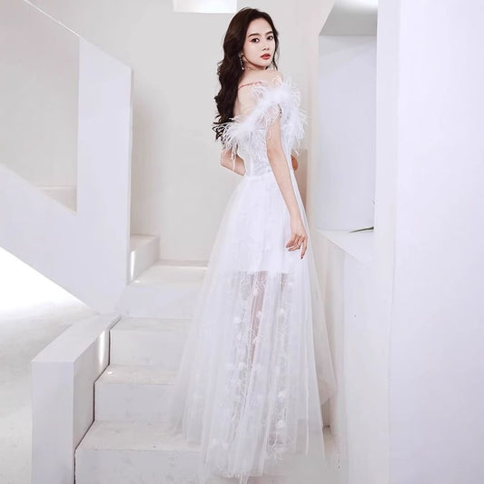 Sleeveless Off Shoulder Plain Embroidered Feather Trim High-Low Mesh A-Line Wedding Gown