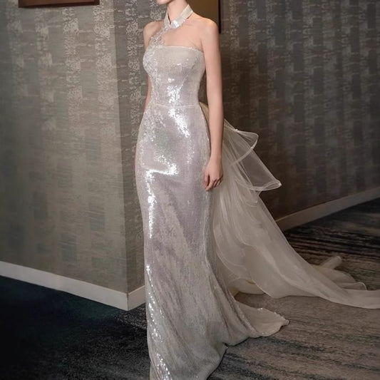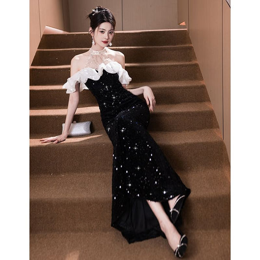 Halter Mandarin Collar Sequin Panel Mesh Trumpet Evening Gown