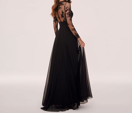 Long Sleeve Mock Neck Plain Panel Lace A-Line Evening Gown