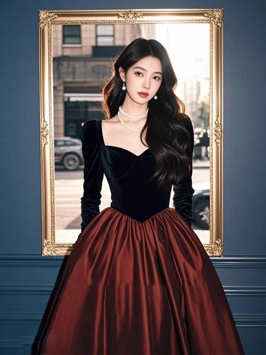Long Sleeve Sweetheart Neck Two Tone Satin Panel Velvet A-Line Cocktail Dress