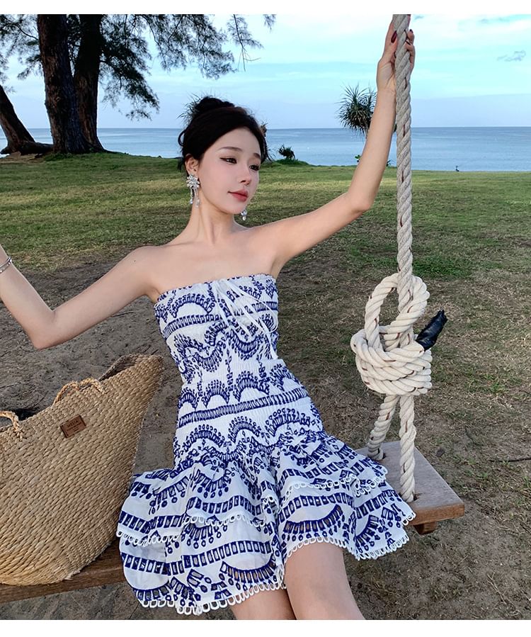 Embroidered Ruched Mini A-Line Tube Dress
