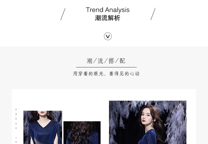 Evening Plain V-Neck Fringed Glitter Mermaid Elbow-Sleeve Gown Slit