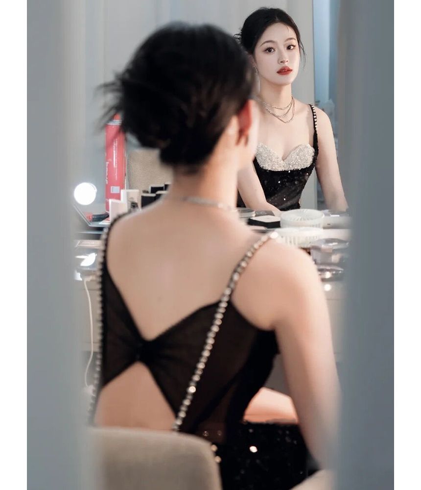 Evening Spaghetti Gown Faux Sequined Mermaid Panel Pearl Mesh Strap