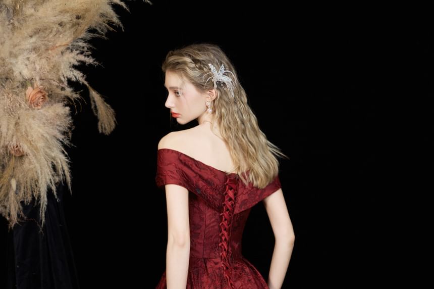 Floral Short-Sleeve A-Line Evening Off-Shoulder Gown