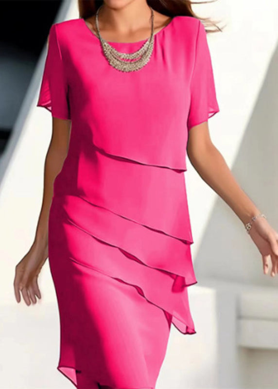French Khaki O-Neck Layered Solid Chiffon Maxi Dresses Short Sleeve