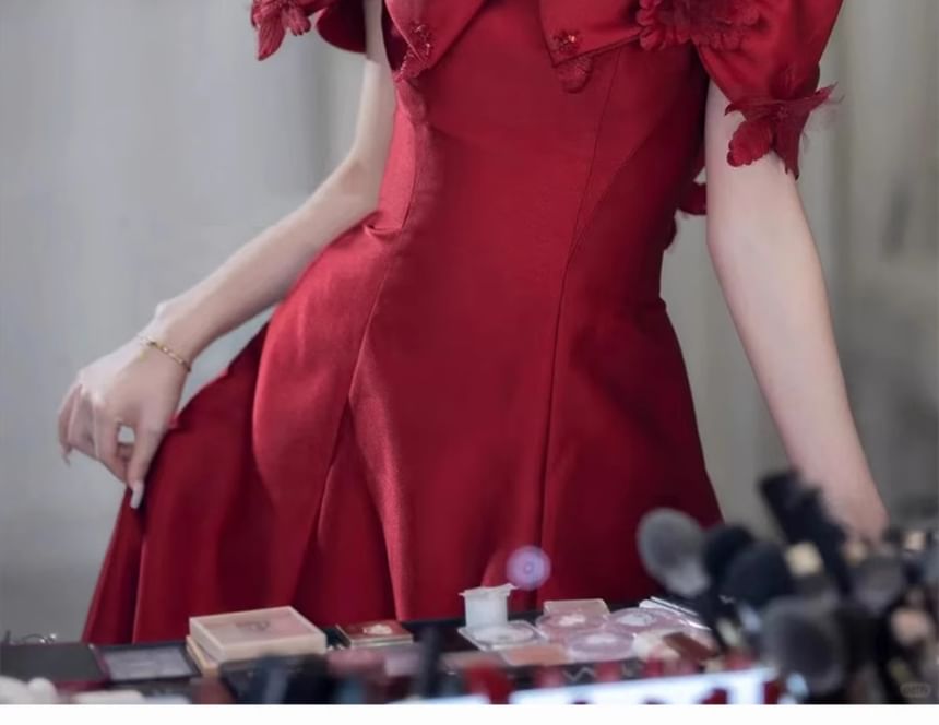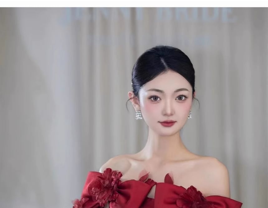 Off-Shoulder Plain Bow Flower Accent A-Line Evening Gown